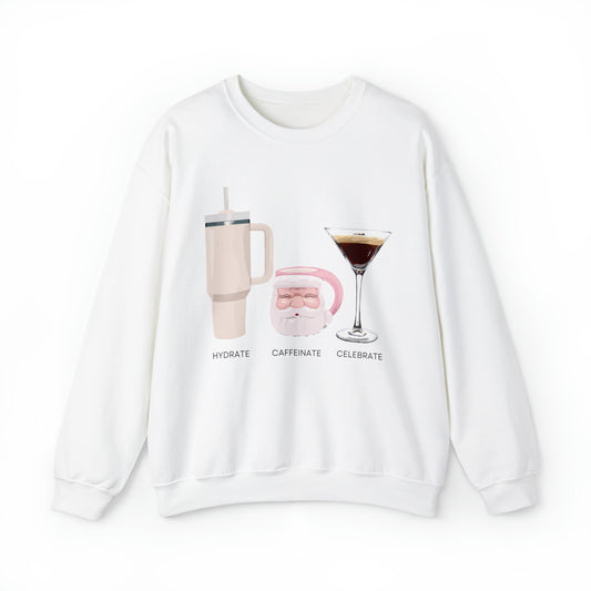 Festive Hydrate Caffeinate Celebrate Crewneck - Water Coffee Espresso Martini